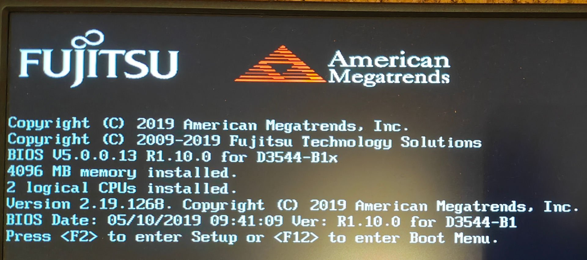 Hit F2 at power-on to get into the BIOS. This describes itself as Aptio Setup Utility and is an American Megatrends and reported 'Version 2.19.1268' and 'Core Version 5.0.0.13'. Selecting System Information took me to another screen where it gave the BIOS Revision as R1.10.0, built 05/10/2019.